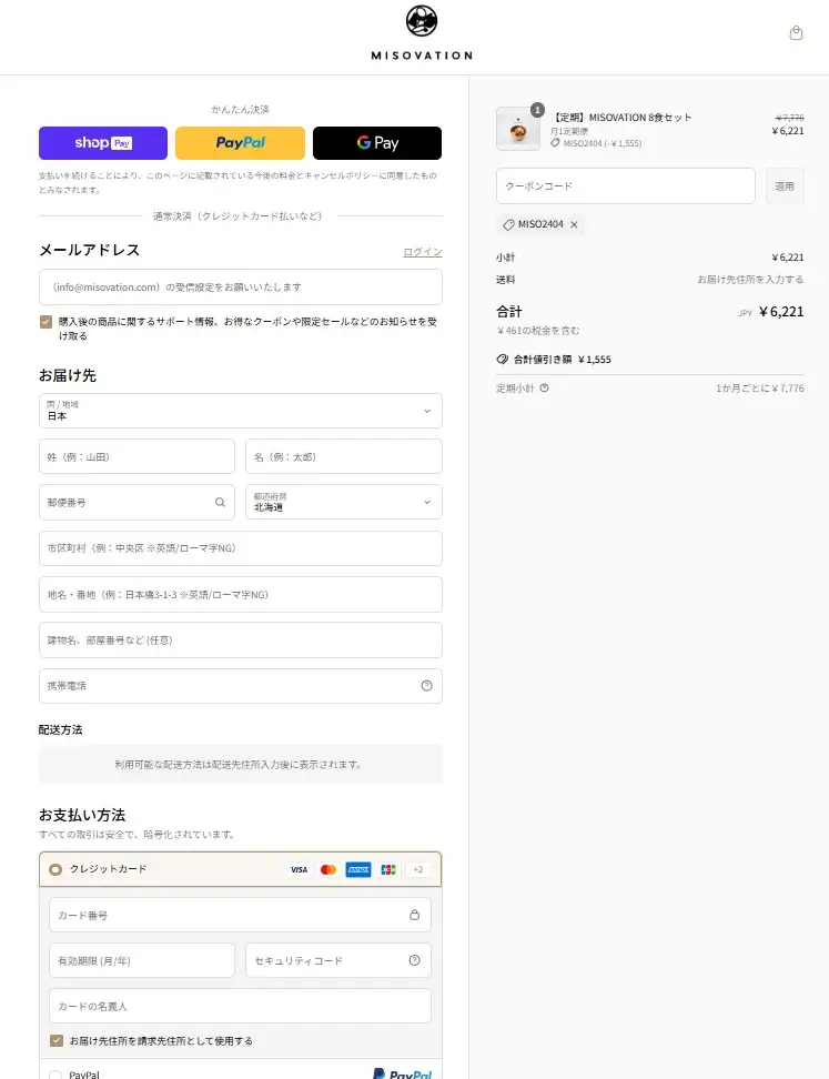 配送方法と支払方法を選択し、必要な情報を入力してください。